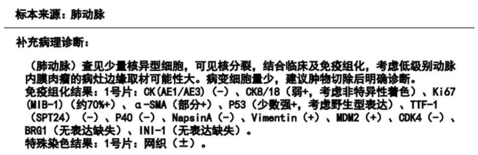 结合CTPA影像特征,高度怀疑肺动脉肉瘤,遂行右心导管+经导管肺动脉占位活检,活检病理提示肺动脉肉瘤。
