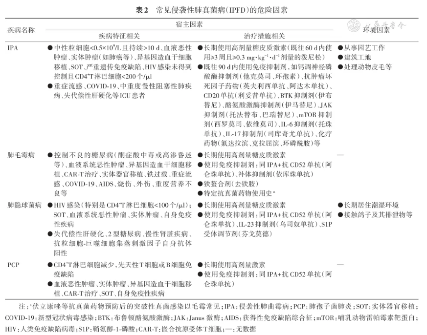 普通人群中少见IPFD的发病率较低,但特定高危人群中呈逐渐上升趋势,且不同地区及人群间的病原谱存在差异,具有一定的特殊性。其宿主因素、流行病学特征、临床表现、病原学诊断及治疗详见表9。