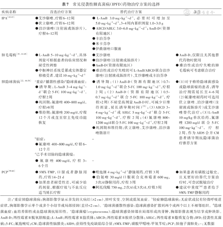 IPFD常用的治疗药物包括多烯类、三唑类及棘白菌素类(表6)。临床用药时需结合其药代动力学(pharmacokinetics,PK)、药效学(pharmacodynamics,PD)特征以及患者的特殊病理生理状况合理选择[39]。两性霉素B脱氧胆酸盐(AmB-D)肾毒性高,两性霉素B脂质体(L-AmB)和两性霉素B胶状分散体(ABCD)肾毒性显著降低,在肝肾功能不全患者中通常无需调整剂量[40]。多数三唑类抗真菌药口服生物利用度良好,组织分布广泛,尤其是肺支气管组织中渗透率较高。伏立康唑、伊曲康唑主要通过细胞色素P450(CYP)酶代谢,并对该酶系统具有抑制作用;泊沙康唑主要经尿苷二磷酸葡萄糖醛酸转移酶1A4(UGT1A4)代谢;而艾沙康唑在肝脏中的代谢程度较低。氟康唑主要经肾脏排泄,需根据肌酐清除率调整剂量,艾沙康唑的排泄途径涉及肝肾两者,相对均衡。需注意的是,唑类抗真菌药物具有潜在的胚胎毒性,妊娠早期应禁用[41]。棘白菌素类药物包括卡泊芬净、米卡芬净和瑞扎芬净,蛋白结合率均大于90%。卡泊芬净、米卡芬净主要通过CYP酶代谢,瑞扎芬净药物相互作用风险较低,其代谢产物主要经胆汁排泄,仅少量经肾脏排出。棘白菌素类在肝肾功能受损患者中安全性相对较好,但妊娠期仍应慎用。老年患者常合并多种基础疾病,使用抗真菌药物时需特别关注肝肾功能变化对药物代谢产生的潜在影响。