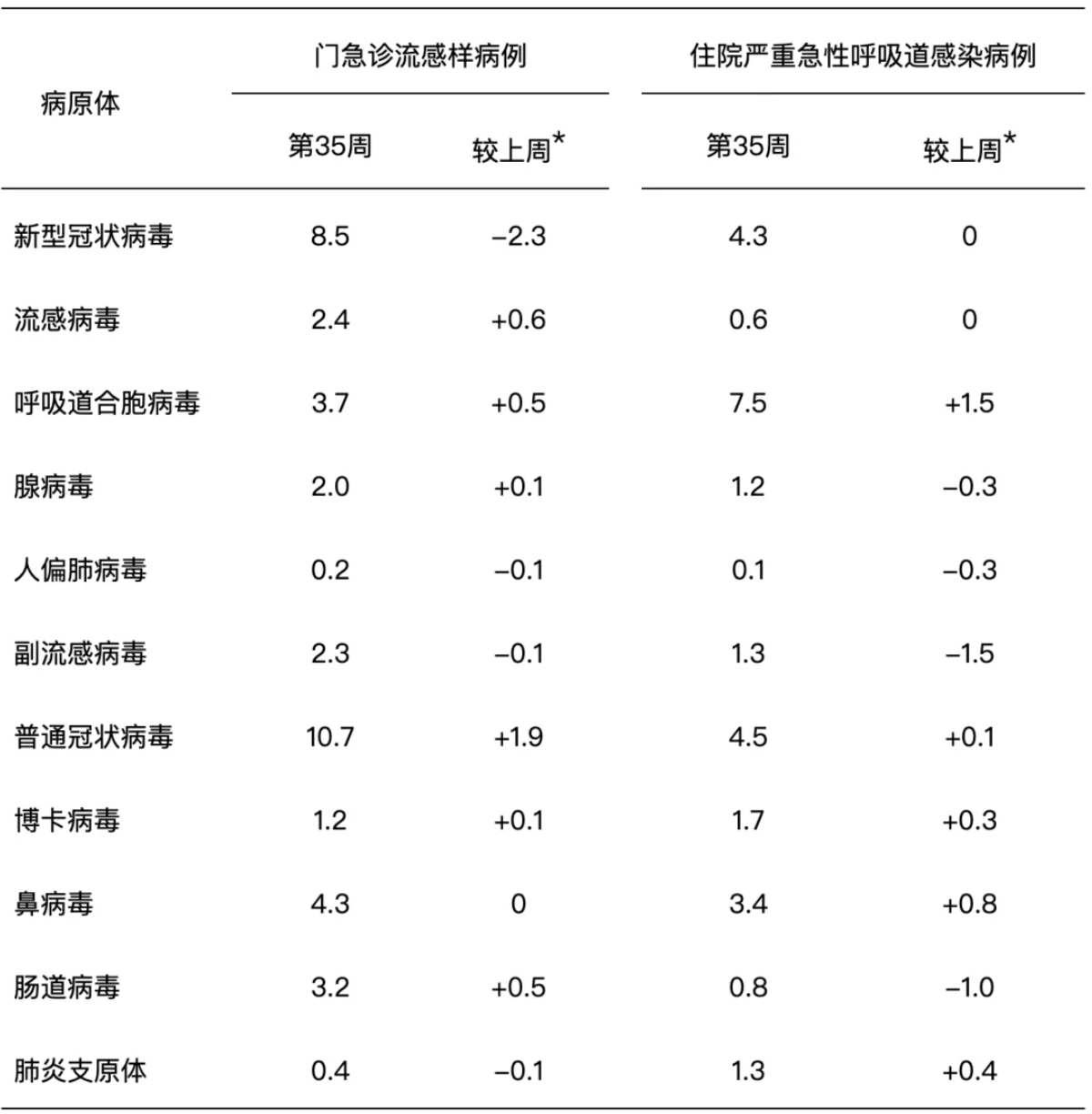 2025年第35周(2025年8月25日—8月31日),对全国哨点医院(不含港澳台)采集的门急诊流感样病例和住院严重急性呼吸道感染病例的呼吸道样本,开展新型冠状病毒、流感病毒、呼吸道合胞病毒、腺病毒、人偏肺病毒、副流感病毒、普通冠状病毒、博卡病毒、鼻病毒和肠道病毒等10种病毒以及肺炎支原体在内的多种呼吸道病原体检测。