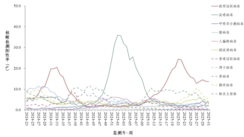 2025年第31周(2025年7月28日—8月3日),对全国哨点医院(不含港澳台)采集的门急诊流感样病例和住院严重急性呼吸道感染病例的呼吸道样本,开展新型冠状病毒、流感病毒、呼吸道合胞病毒、腺病毒、人偏肺病毒、副流感病毒、普通冠状病毒、博卡病毒、鼻病毒和肠道病毒等10种病毒以及肺炎支原体在内的多种呼吸道病原体检测。