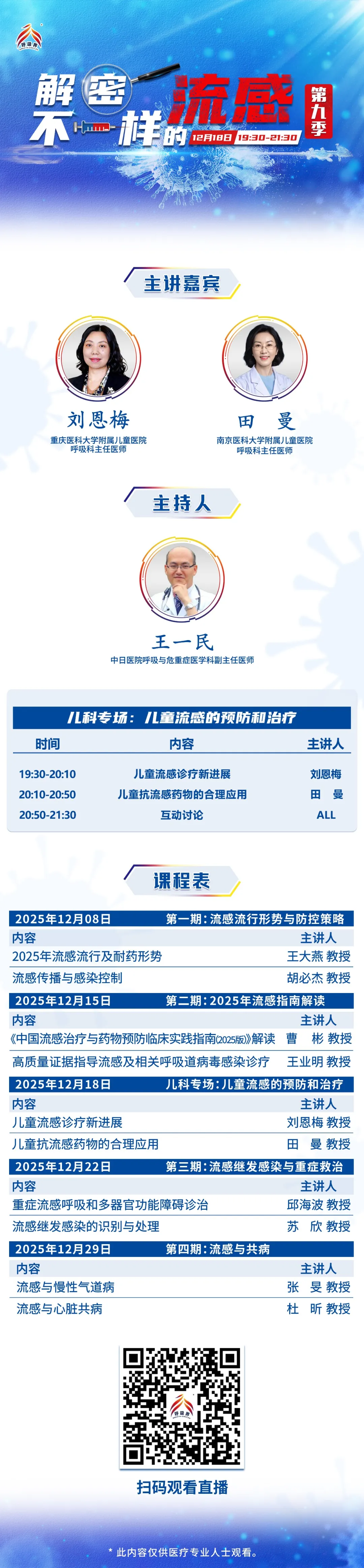2025年12月,《呼吸界》“解密不一样的流感”系列直播节目已重磅开启!本周四(18日),儿科专场的内容精彩继续!