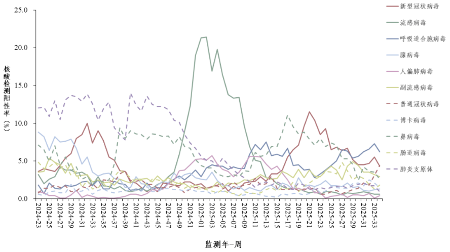 2025年第34周(2025年8月18日—8月24日),对全国哨点医院(不含港澳台)采集的门急诊流感样病例和住院严重急性呼吸道感染病例的呼吸道样本,开展新型冠状病毒、流感病毒、呼吸道合胞病毒、腺病毒、人偏肺病毒、副流感病毒、普通冠状病毒、博卡病毒、鼻病毒和肠道病毒等10种病毒以及肺炎支原体在内的多种呼吸道病原体检测。