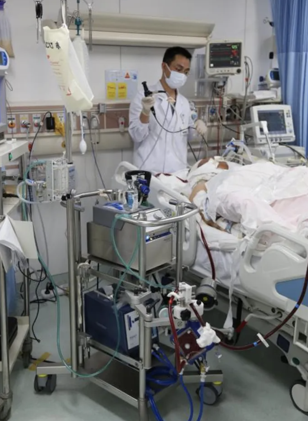 「到达武汉后,我们很快建立了临时病房,组建了一个有10张床左右的ICU病房,医疗组分为『红绿蓝』三组,谁带哪一组?如何交接?很快就排好了班,秩序井然……我们从北京带来了包括ECMO在内的所有设备,甚至连针头都带上了,因为想在当地找这些装置,几乎不大可能马上得到。」
